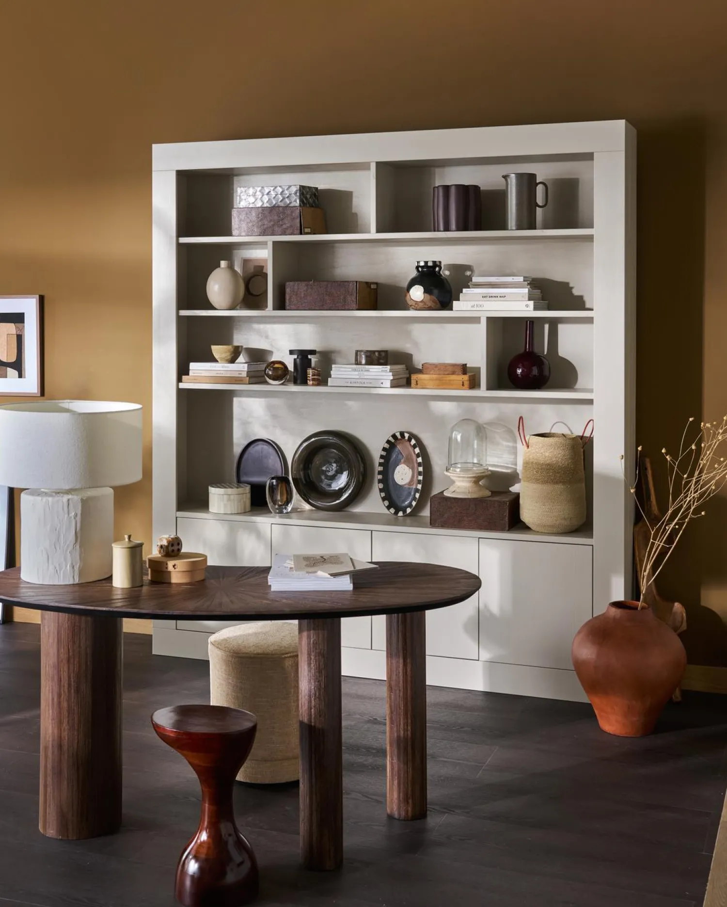 Deze wandkast is jouw persoonlijke gallery wall. Stel je voor: je mooiste boeken, vazen, planten en reissouvenirs krijgen eindelijk de plek die ze verdienen. De open vakken zijn perfect voor styling, terwijl de deurtjes al die minder fotogenieke spullen netjes wegwerken.