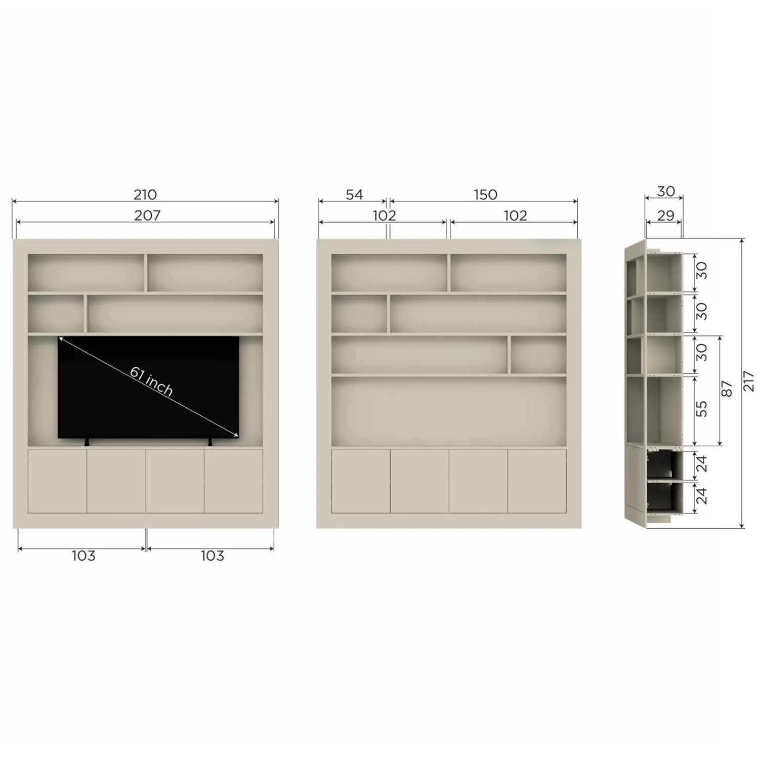 Met 31 cm diepte neemt de kast niet teveel ruimte in beslag, maar biedt wel een zee aan opbergruimte. Perfect voor je woonkamer, studeerkamer of zelfs de slaapkamer. Waar je hem ook plaatst, hij wordt gegarandeerd het middelpunt van de ruimte. Het is ook mogelijk om een televisie in deze wandkast te plaatsen (zie afbeeldingen). Voor een stabiel en veilig gebruik raden we aan om extra aandacht te besteden aan de muurbevestiging.
