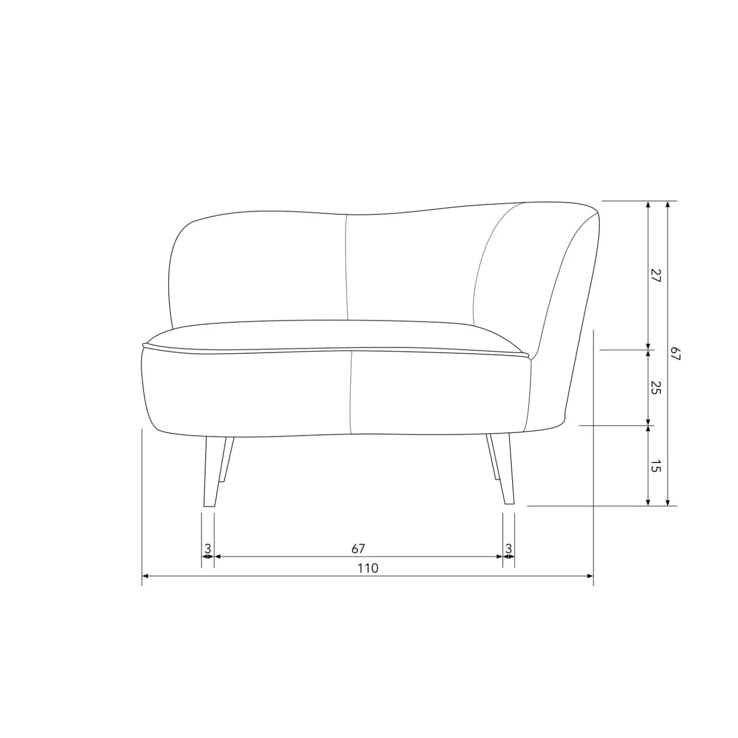 De zithoogte van de fauteuil is 42 cm, de zitbreedte is 86 cm en de zitdiepte is 50 cm. De hoogte van de rugleuning is 29 cm en de maximale draagkracht is 120 kg.