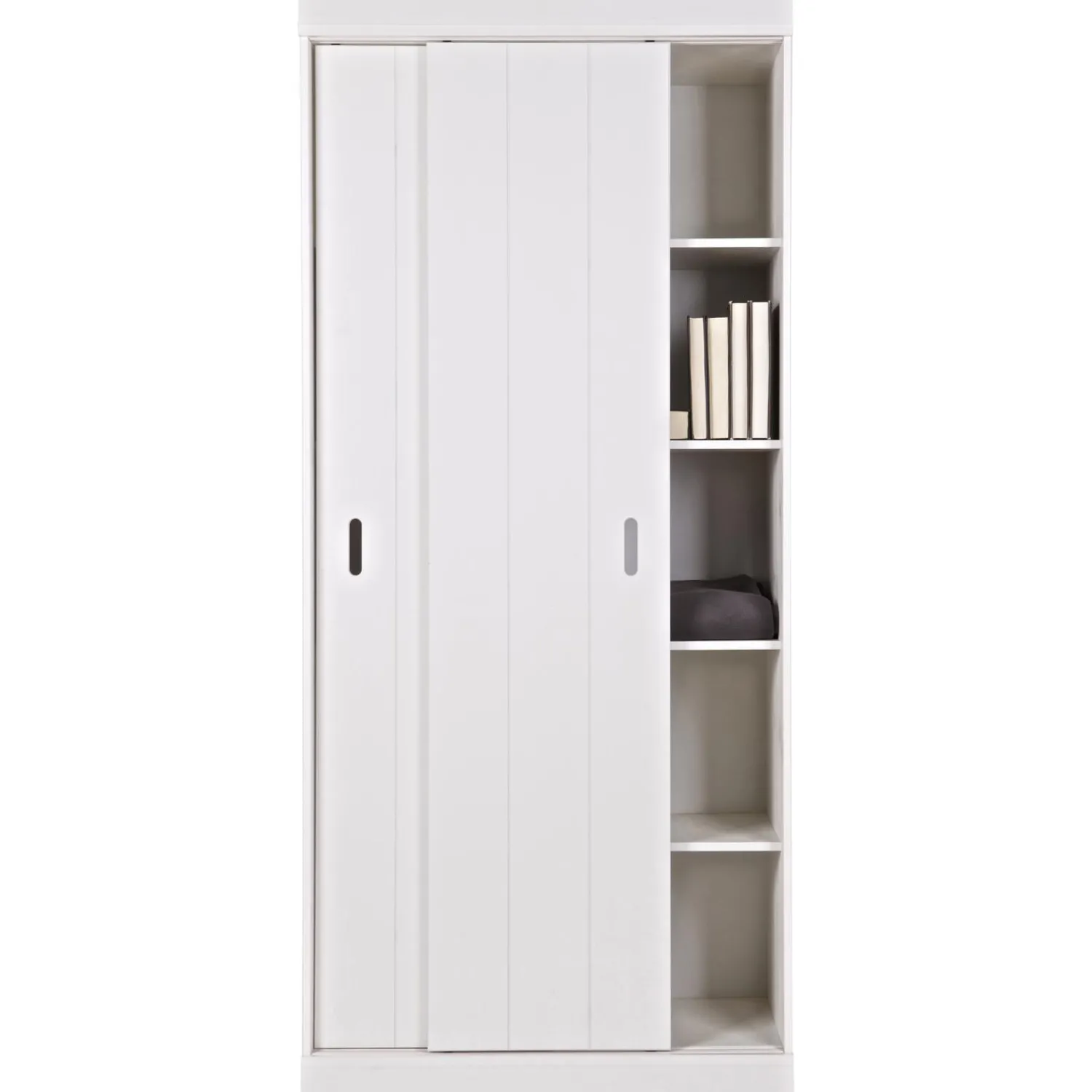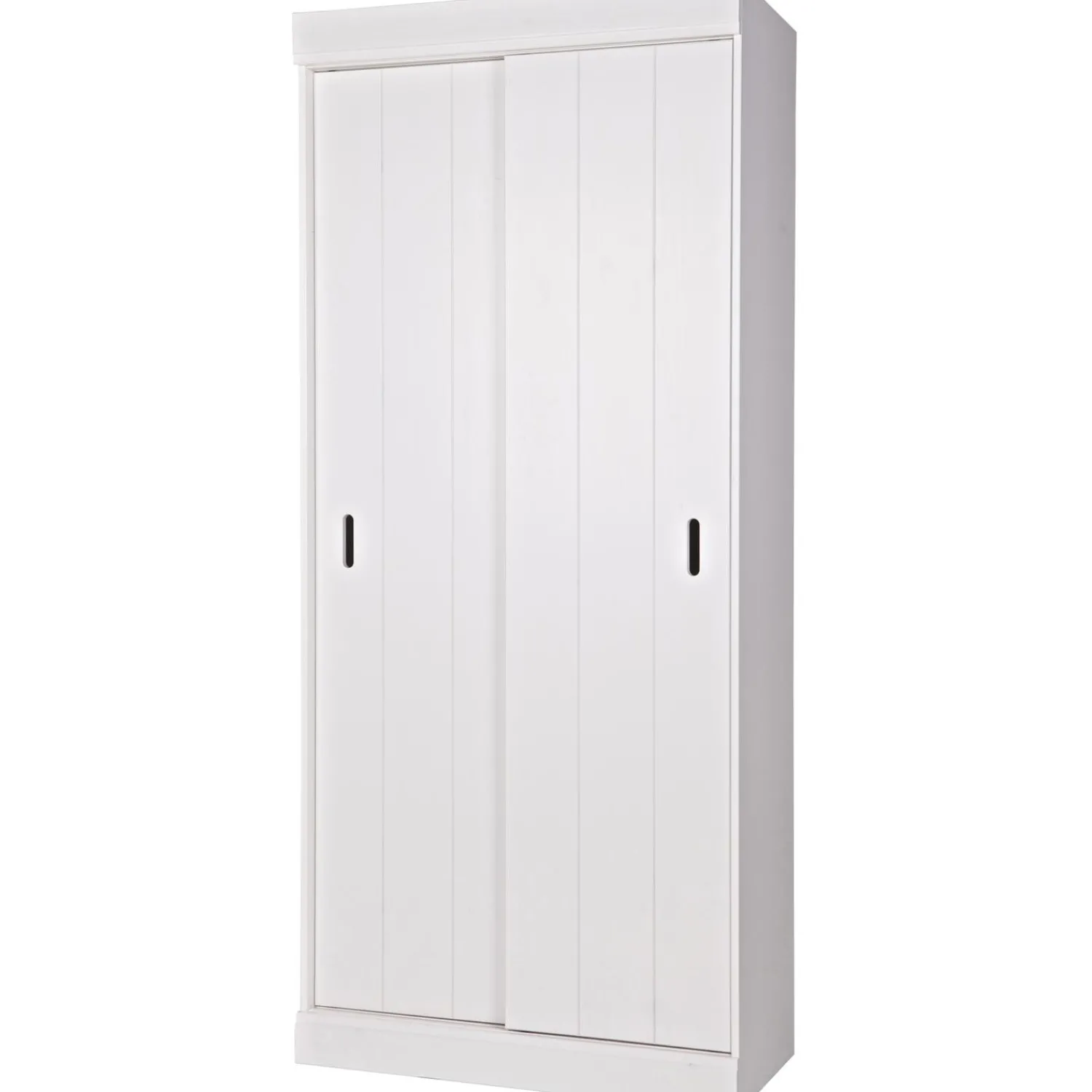 De Row is een trendy basic opbergkast vol met legplanken (zonder tussenschot). De kast Row heeft twee strokendeuren met sleuven gecombineerd met een strakke sokkel en koof. Het voordeel van deze kast is dat de kast prima in een kleine ruimte geplaatst kan worden dankzij de schuifdeuren. Deze kast is uitgevoerd in massief grenenhout, afkomstig van een FSC-gecertificeerde leverancier, en afgewerkt in de frisse kleur wit. Met deze kast is ook goed een mooie kastenwand te creëren want de kast is goed naast elkaar te plaatsen. De kast wordt geleverd als bouwpakket met een duidelijke montage-instructie.
