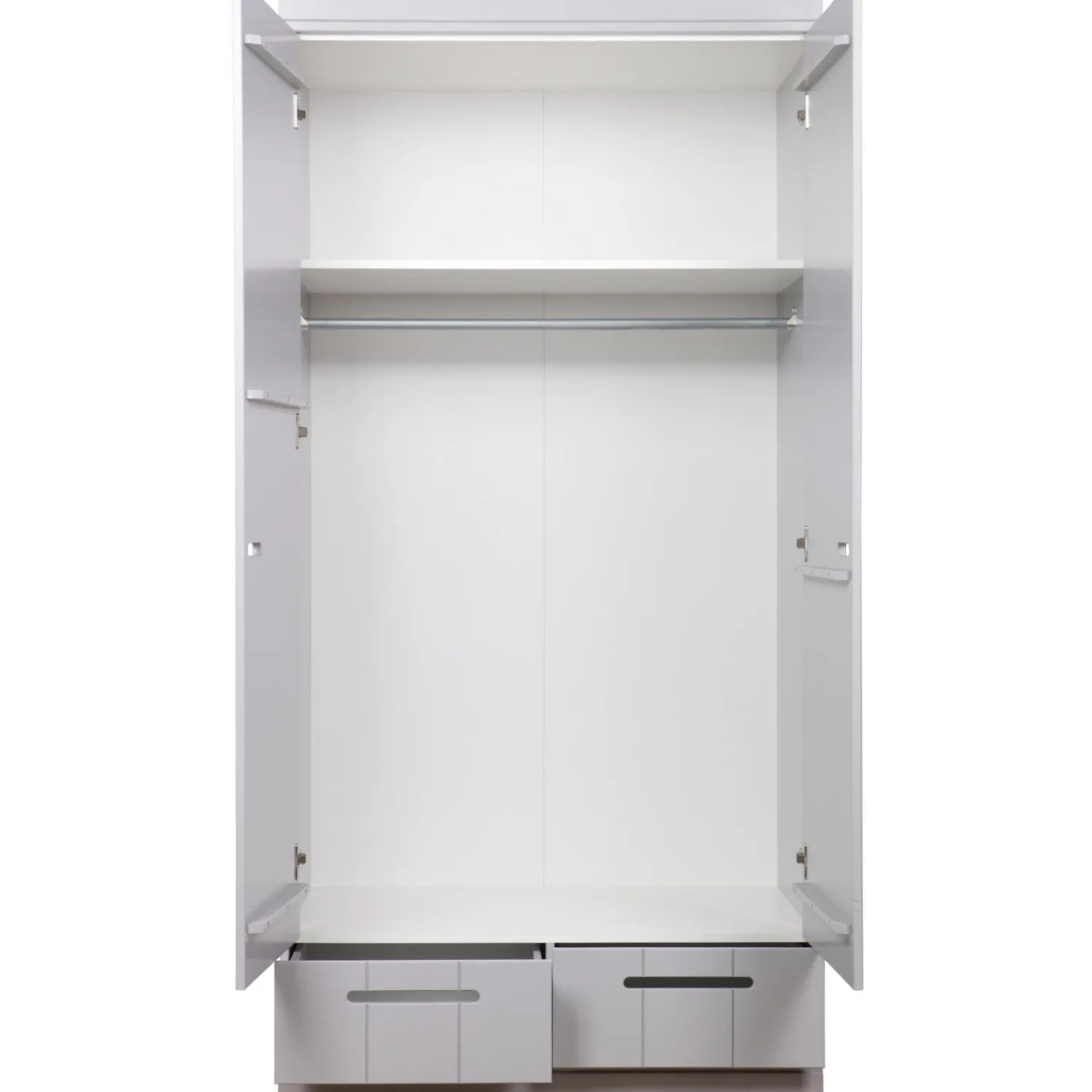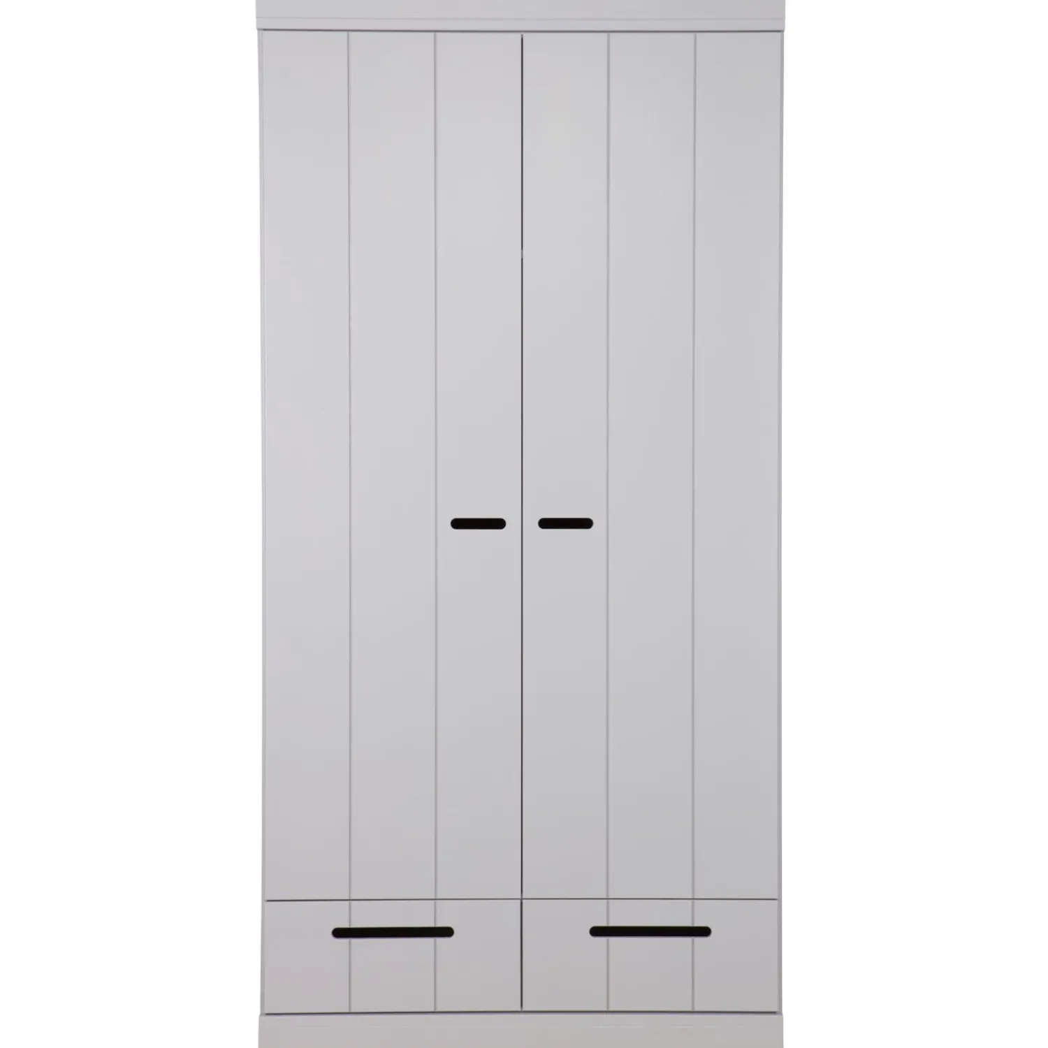 Nu ook in de kleur betongrijs. Uit de serie CONNECT; een stoere basic 2-deurs kledingkast met strakke sokkel en koof gecombineerd strokendeuren met sleufgrepen en 2 lades voorzien van solide metalen ladegeleiders. Met de CONNECT kasten kun je je eigen kastenwand bouwen! De romp van de CONNECT kledingkast is gemaakt van massief grenenhout dat afkomstig is van een FSC gecertificeerde leverancier. De binnenzijde is voorzien van gemêlamineerde legplanken, praktisch met schoonmaken! De kasten zijn in de kleur wit gespoten met een watergedragen lak).