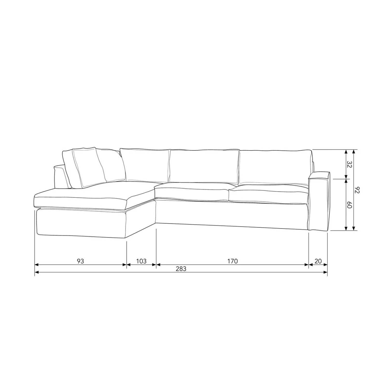 De zitdiepte van de bank is 63 cm, de totale diepte van het loungegedeelte is 197 cm. De hoogte van de armleuning is 60 cm. Deze bank wordt in losse elementen geleverd. De elementen zijn eenvoudig met elkaar te verbinden door middel van beugels. De bruine, houten blokpoten worden gemonteerd geleverd. Klik hier voor meer informatie over het bezorgen.