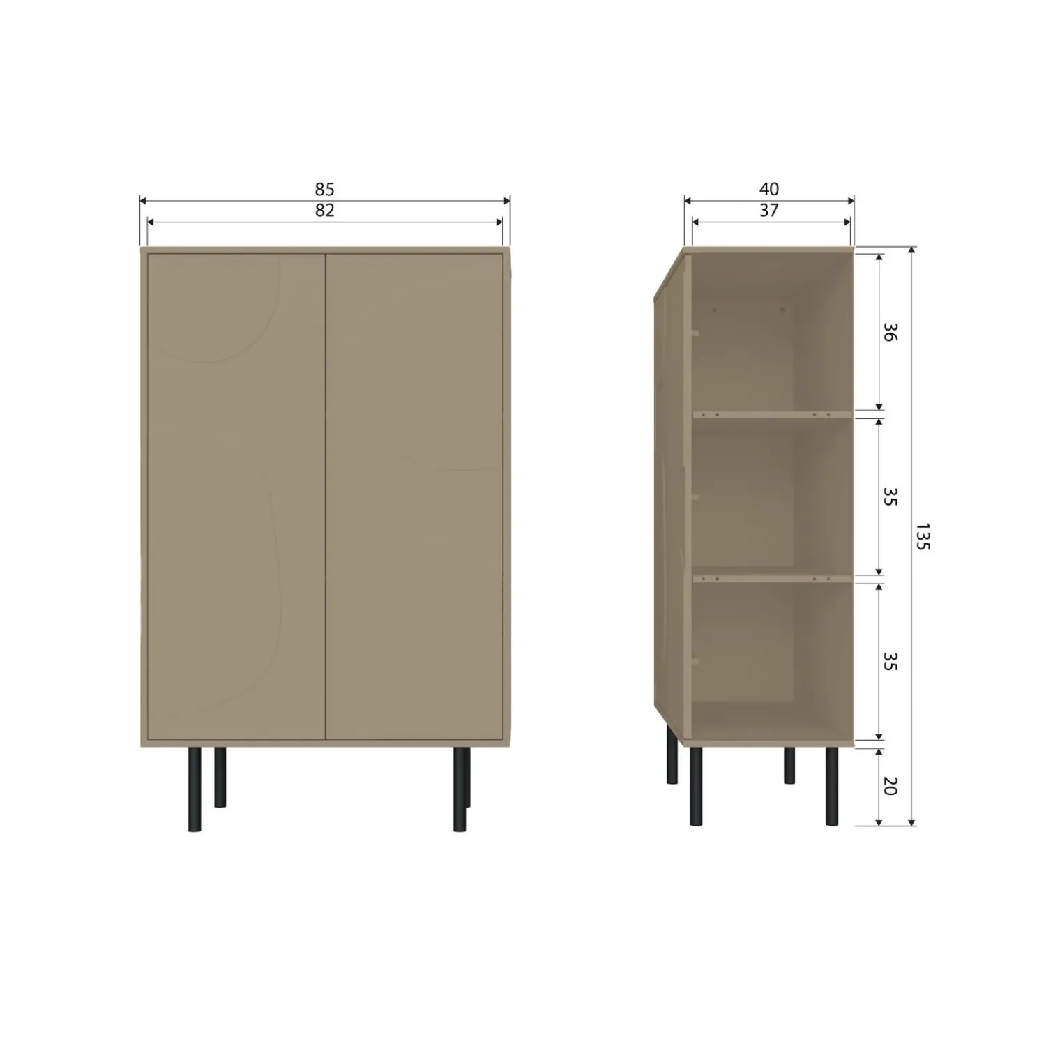 Cadiz heeft een hoogte van 135cm, een breedte van 85cm en een diepte van 40cm. De 2 deuren hebben een speels houtpatroon en een afmeting van H 115 cm x B 42,5 cm. De 3 vakken achter deze deuren hebben een grootte van H 36 cm x B 80 cm x D 36 cm. Het draaggewicht per plank is 15 kg. De Cadiz kast heeft een pootje met een hoogte van 20cm, waardoor de kast een ruimtelijk gevoel krijgt.
