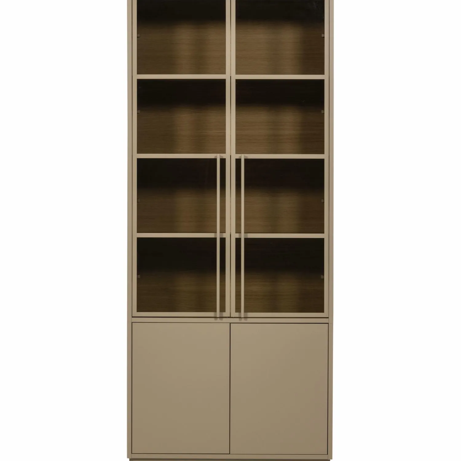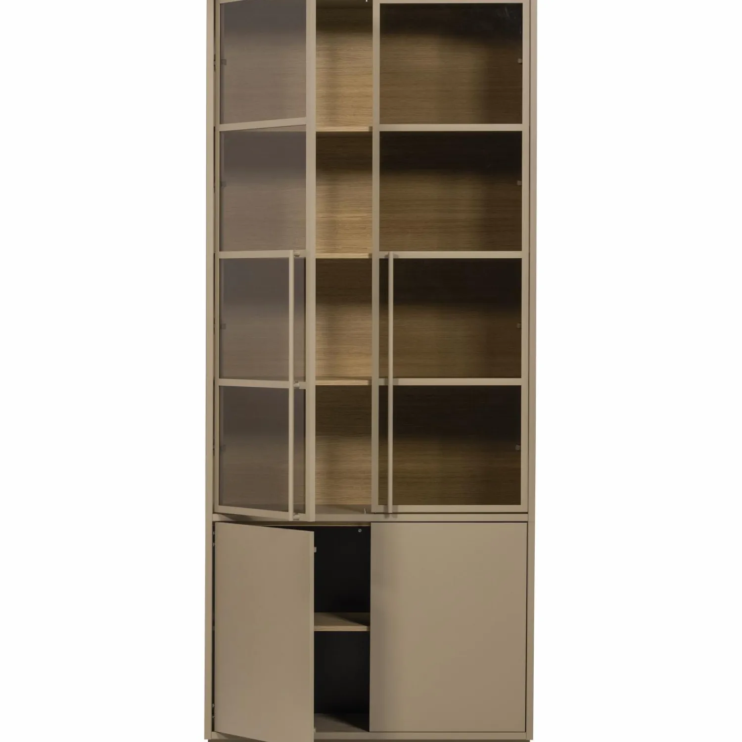 De vier ruime bovenvakken zijn perfect om je mooiste accessoires, boeken of servies te laten zien. Achter de glazen deuren creëer je een stijlvolle etalage met het warme eiken decor als achtergrond. De mud kleur is de perfecte neutrale tint die zowel bij warme als koele kleuren werkt.
