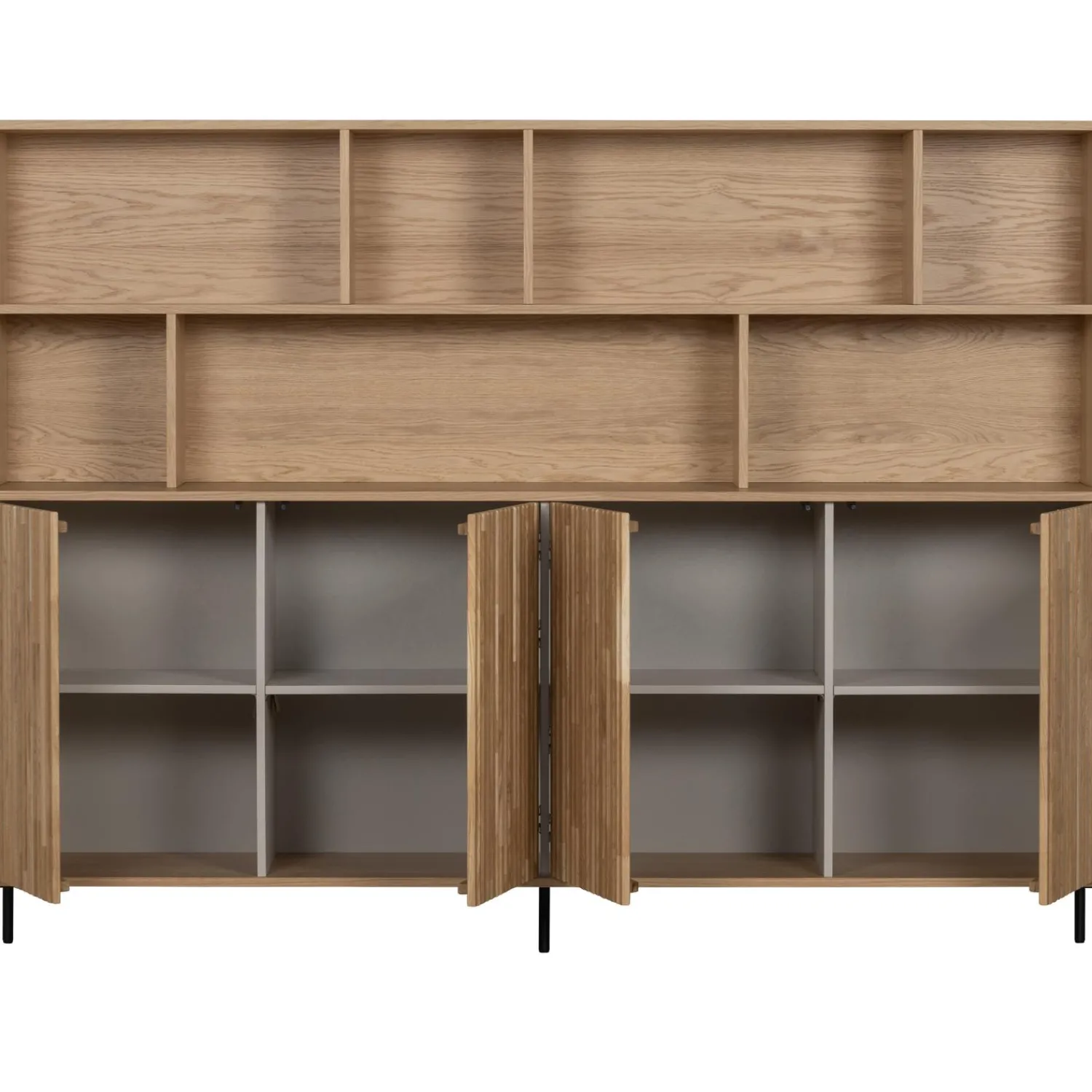 De New Gravure wandkast heeft een hoogte van 150 cm. De breedte is 200 cm en 44 cm diep. De opzetkast heeft een diepte van 30 cm. De bovenste vakkenrij heeft een hoogte van 31 cm en verschillende breedtes van +/- 60 cm en +/- 31 cm. De onderste vakkenrij heeft drie vakken met een hoogte van eveneens 31 cm en breedtes van 31/100/62 cm. De diepte van de vakken is 28 cm, de tussenpanelen zijn 2,5 cm dik. De vier deuren zijn elk 66 cm hoog, 50 cm breed en 2 cm dik. De dichte kast beschikt over vier uitneembare legplanken die tevens in hoogte verstelbaar zijn. Door de legplanken worden er acht vakken van 32,5×47,5×41 cm (hoogte x breedte x diepte) gecreëerd, genoeg opbergmogelijkheden dus. De metalen poten zijn 15 cm hoog en hebben een diameter(ø) van 2cm.