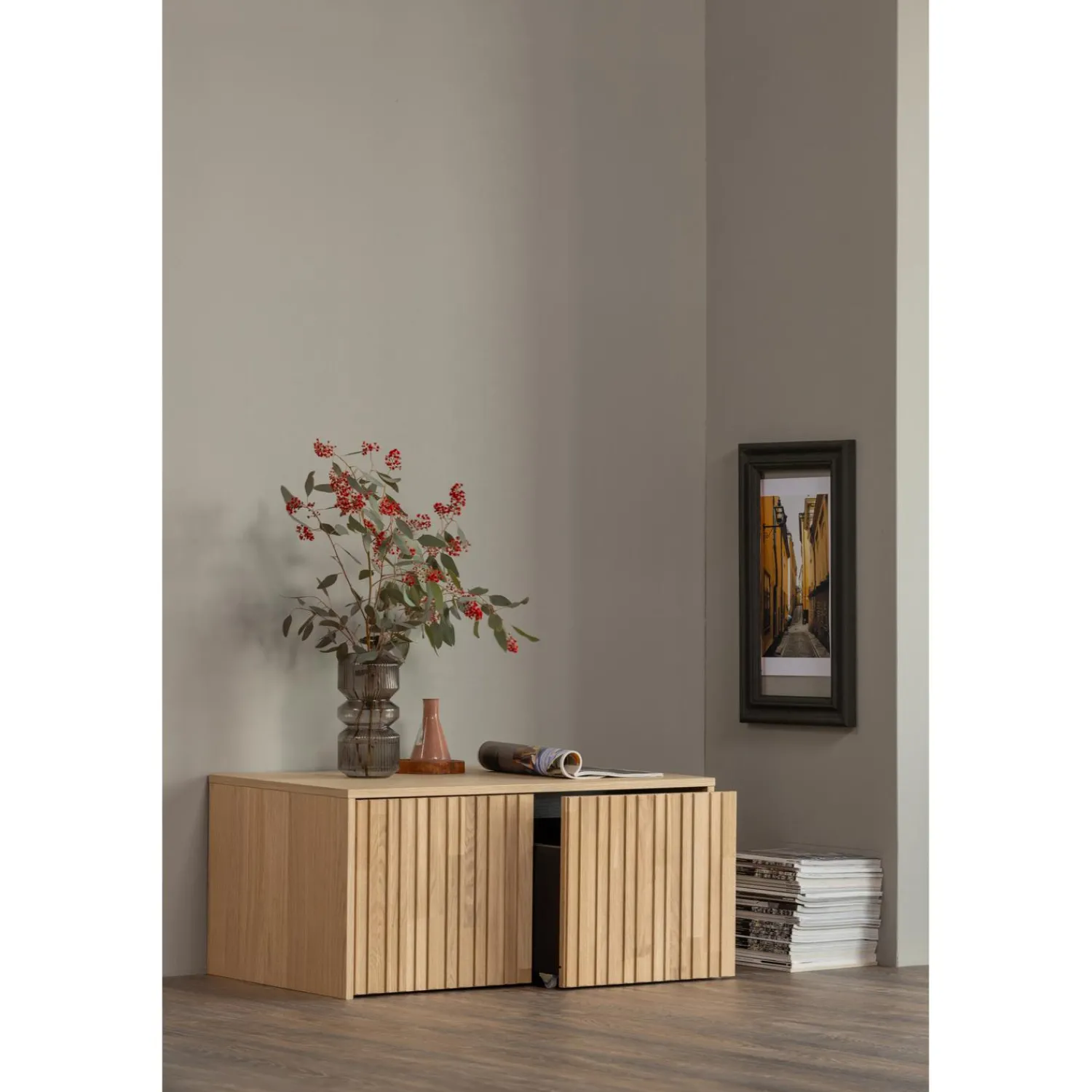Eikenhout wordt gekenmerkt door de lichtbruine tint met een zachtgele gloed en duidelijk zichtbare nerftekening. Het meubel is oorspronkelijk afkomstig van een FSC gecertificeerde leverancier. Behandeld eikenhout is zeer eenvoudig in het onderhoud. Houd het meubel regelmatig stofvrij met een schone, droge doek. Hanteer altijd de basisbescherming voor hout, zoals het gebruik van een onderzetters onder een drinkglas of hete pan.