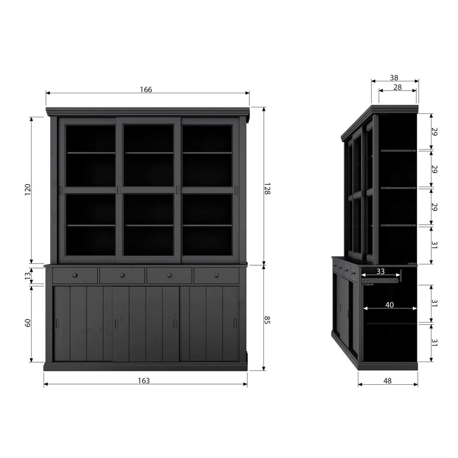 Lagos heeft legplanken met een diepte van 28cm, de diepte van de onderplank is 40cm. Hoogte bovenkast is 128 cm met een breedte van 166cm en een diepte van 38cm. Hoogte deuren bovenkast: 119 cm met een breedte van 53cm. De onderkast van een hoogte van: 85 cm met een breedte van 163cm en een diepte van 48cm. De hoogte van de lades is 13cm met een breedte van 36cm en een diepte van 33cm. Hoogte deuren onderkast: 60 cm met een breedte van 53 cm.
