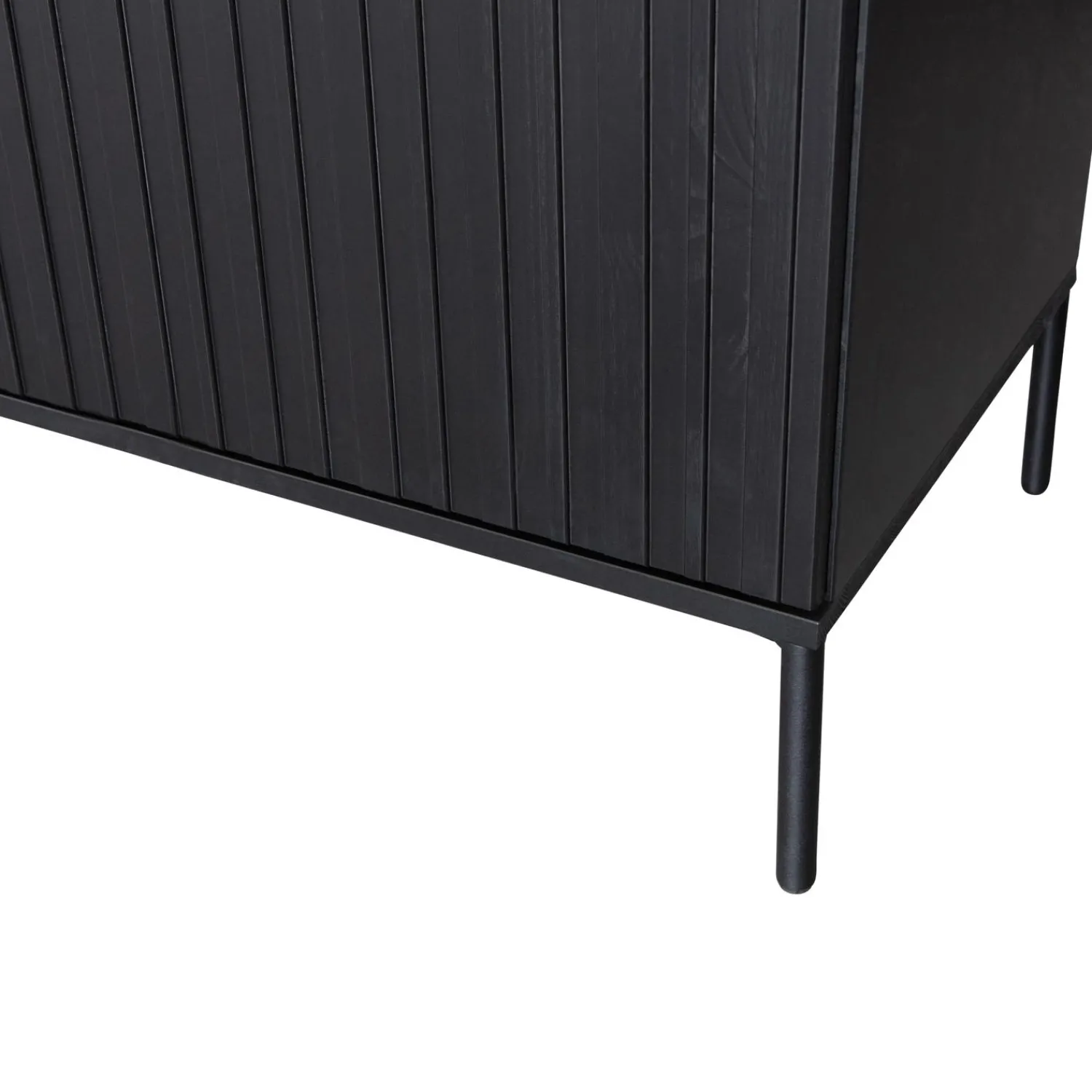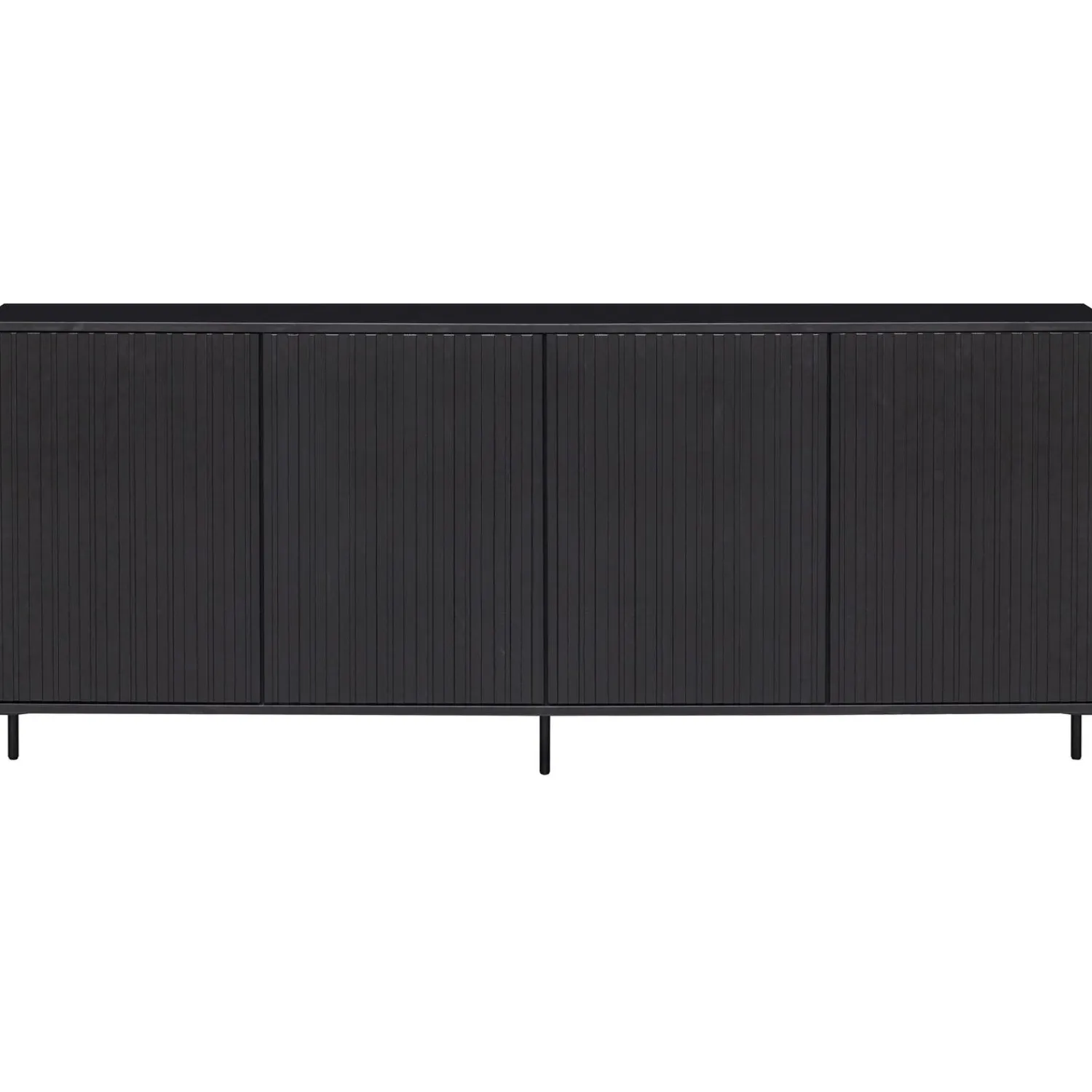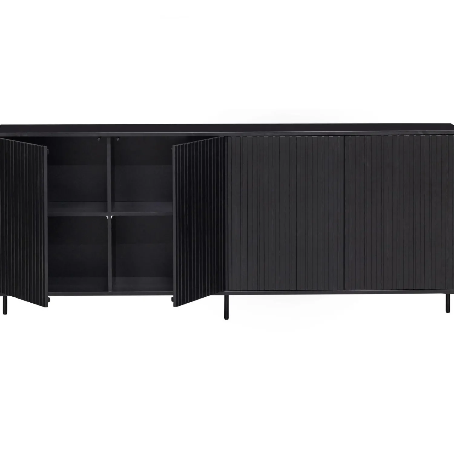 Het New Gravure dressoir heeft een hoogte van 85 cm, breedte van 200 cm en een diepte van 44 cm. De vier deuren zijn elk 66 cm hoog, 50 cm breed en 2 cm dik. Heel handig is dat de vier uitneembare legplanken in hoogte verstelbaar zijn. Je kunt met de legplanken acht vakken van 32,5×47,5×41 cm (hoogte x breedte x diepte) creeeren waardoor je genoeg opbergmogelijkheden hebt. Het interieur is vervaardigd uit zwart spaanplaat. De poten zijn van metaal voorzien van een zwarte coating en zijn 15 cm hoog.