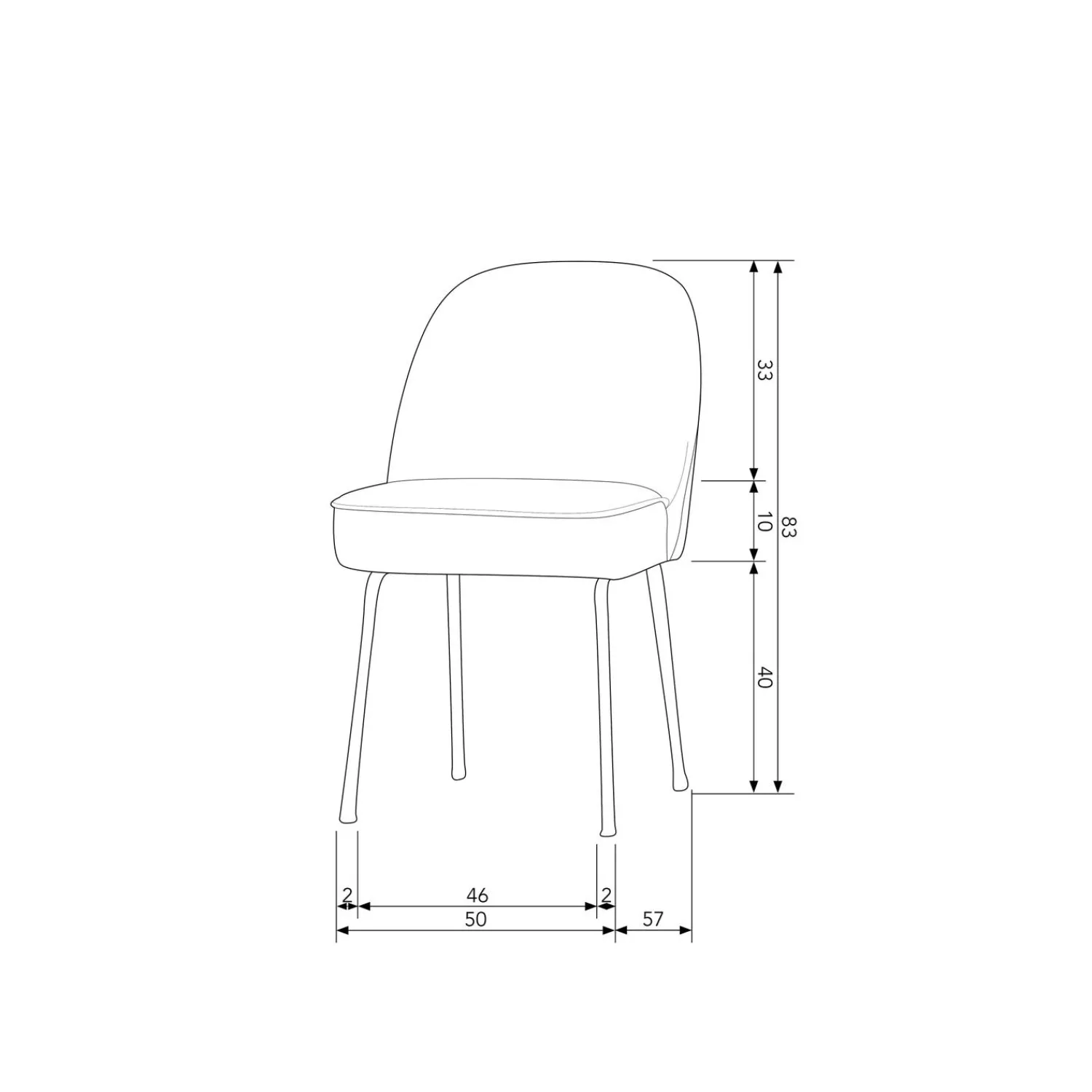 De Vogue eetkamerstoel heeft een hoogte van 83 cm, een breedte van 50 cm en een diepte van 57 cm. De poten hebben een hoogte van 40 cm. De zithoogte is 50 cm, de zitdiepte is 45 cm en de zitbreedte is 50 cm.
