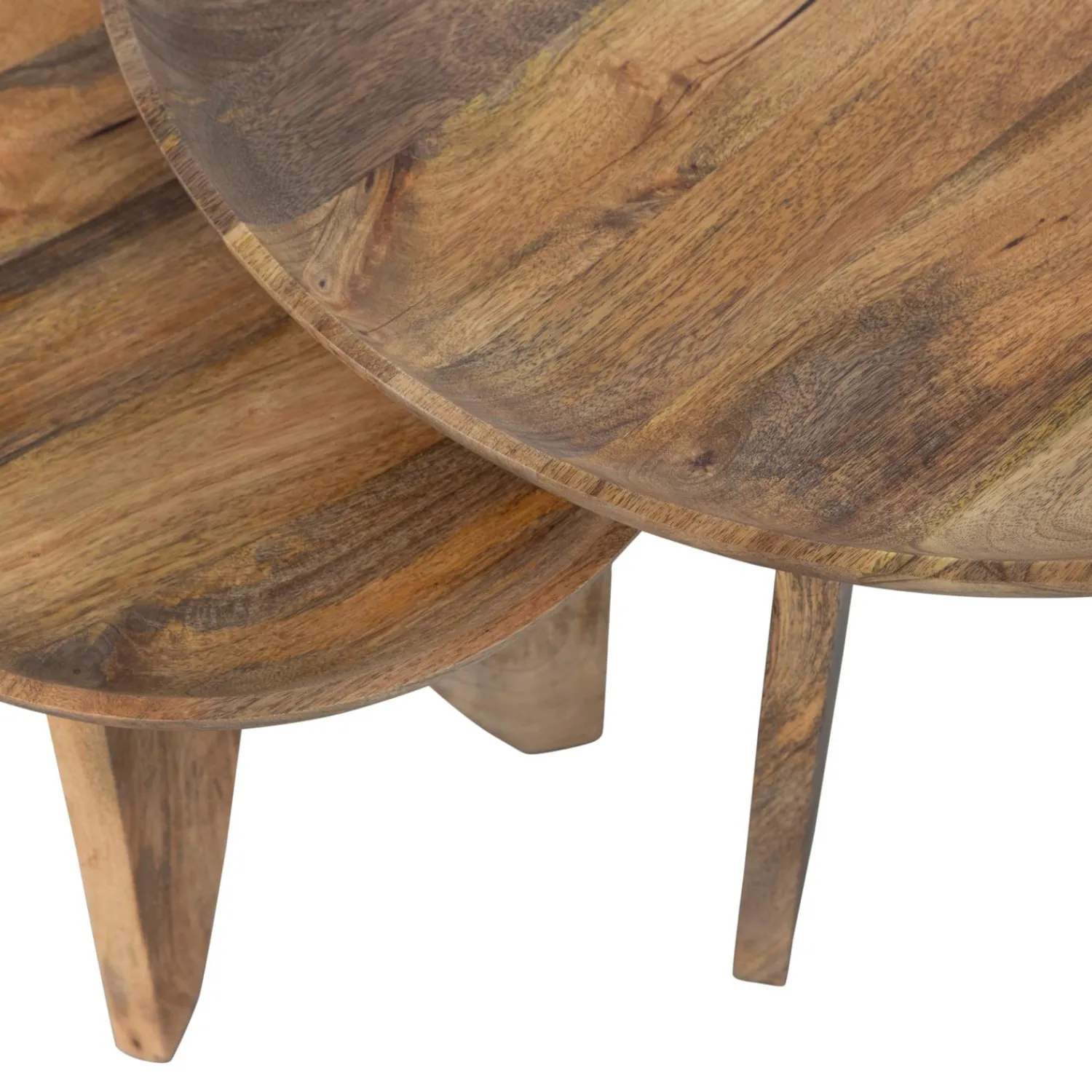 De tafels zijn gemaakt van mangohout, voorzien van een neutrale coating waardoor de eigenschappen van het natuurlijke materiaal goed zichtbaar blijven. Mangohout staat bekend om de warme goudbruine kleur, duurzame groei en lange houdbaarheid. Mangohout wordt ook gekenmerkt door duidelijk zichtbare nerven en kleurnuances. De nerven, een gele gloed of donkere lijnen en knoesten zorgen ervoor dat elk mangohouten item uniek is. Mangohout is zeer sterk en één van de hardere houtsoorten, hierdoor zal een mangohouten item niet snel beschadigen.