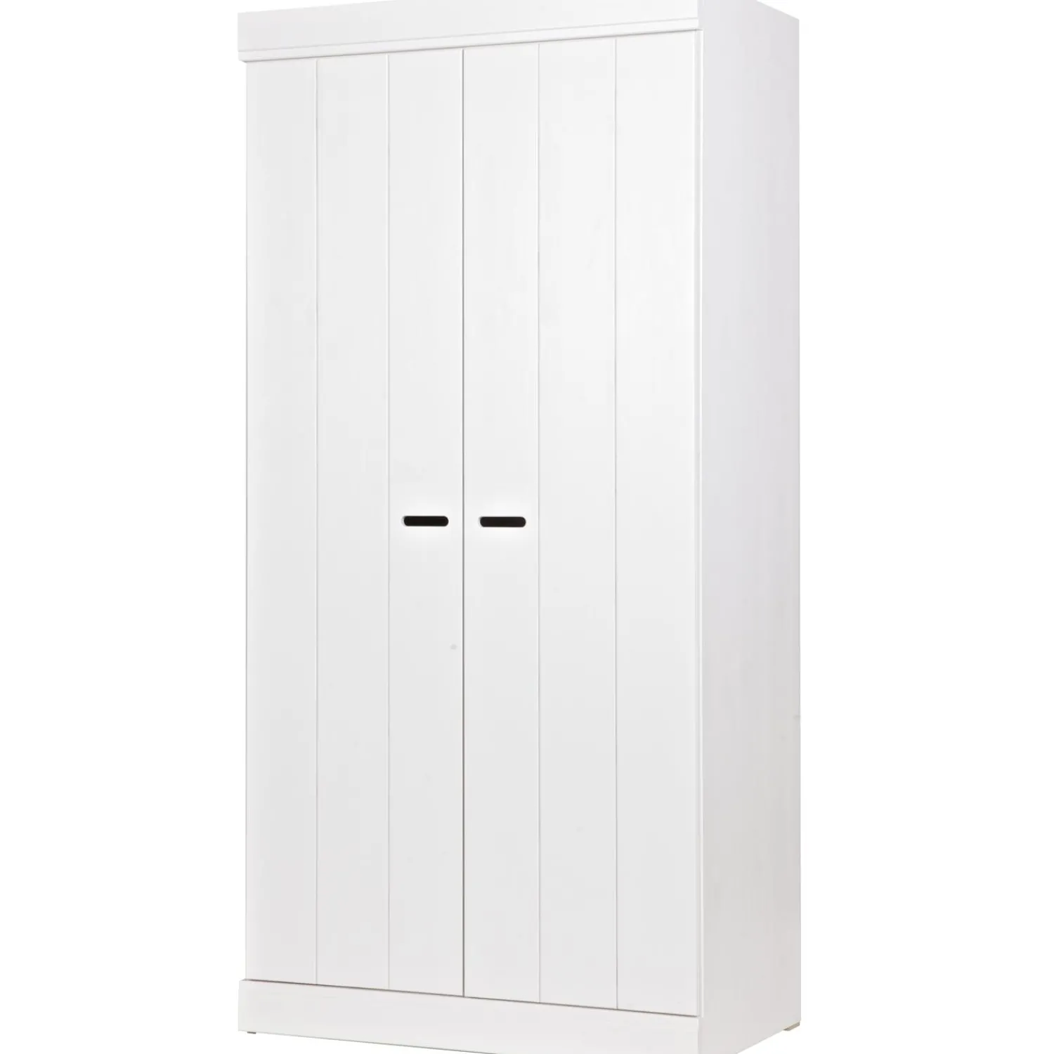 Uit de serie CONNECT; een stoere basic 2-deurs kledingkast met strakke sokkel en koof gecombineerd met strokendeuren met sleufgrepen. Met de CONNECT kasten kun je je eigen kastenwand bouwen! De romp van de CONNECT kledingkast is gemaakt van massief grenenhout dat afkomstig is van een FSC gecertificeerde leverancier. De binnenzijde is voorzien van gemêlamineerde legplanken, praktisch met schoonmaken! De kasten zijn in de kleur wit gespoten, maar je schildert ze zelf binnen een handomdraai ook in een andere kleur (gebruik in dat geval watergedragen lak).