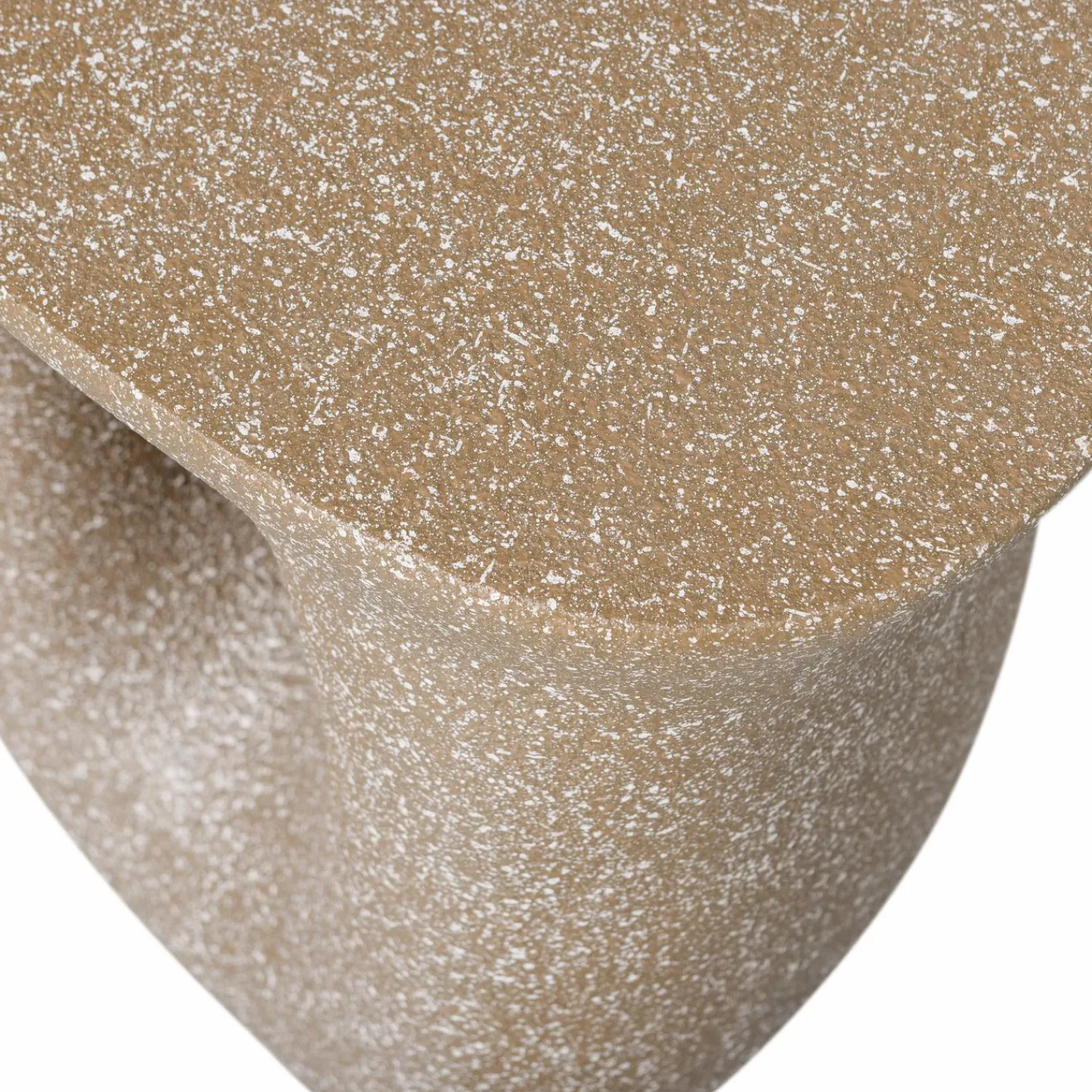 Het organische, sculpturale ontwerp van deze bijzettafel zorgt voor een natuurlijke en moderne uitstraling. De vloeiende lijnen en unieke spikkelstructuur geven het meubel een ambachtelijke, artistieke look. Door zijn opvallende vorm functioneert deze tafel als decoratief accent, ook zonder spullen erop. Het ontwerp past goed bij verschillende woonstijlen en creëert een interessant focuspunt in je woonkamer, slaapkamer of terras.
