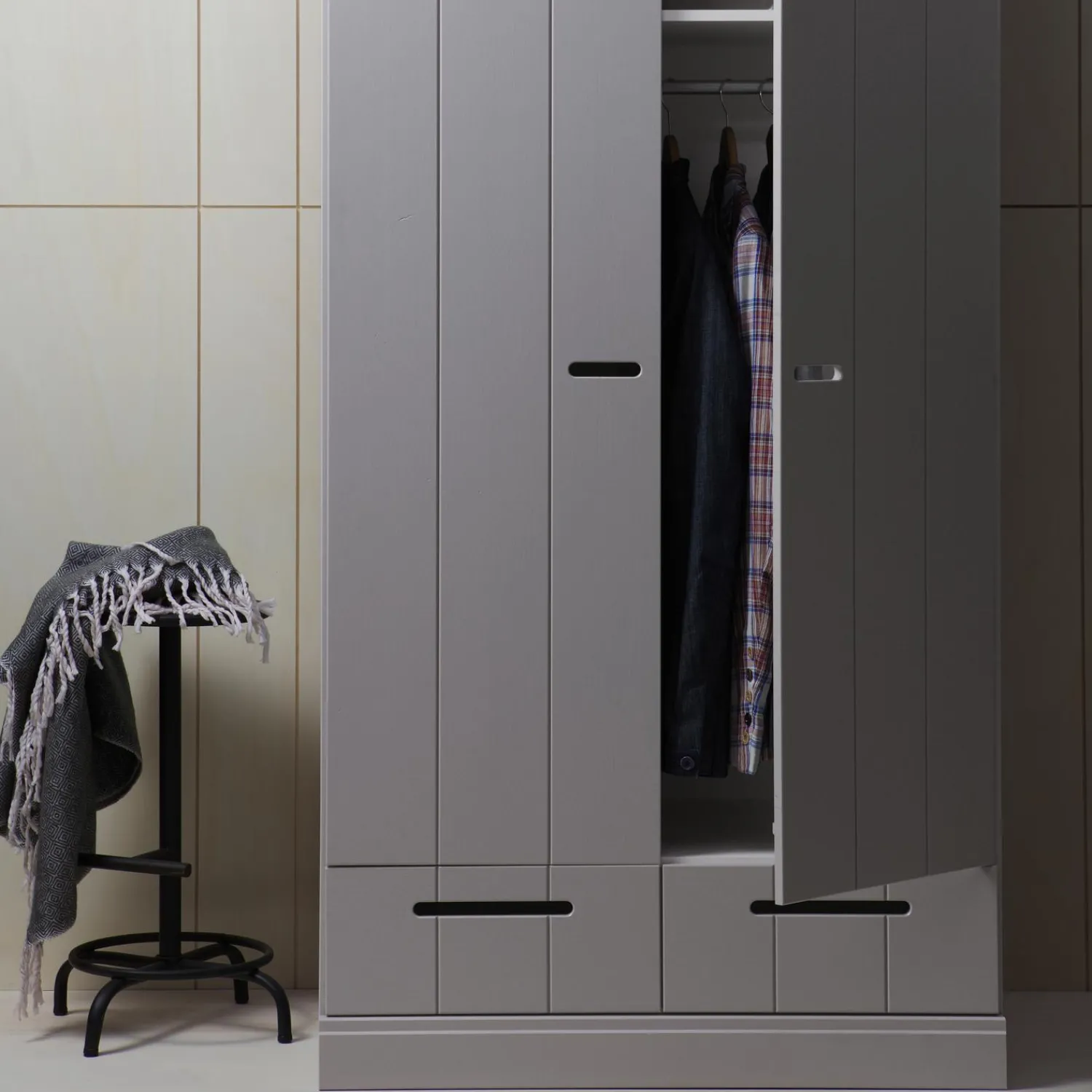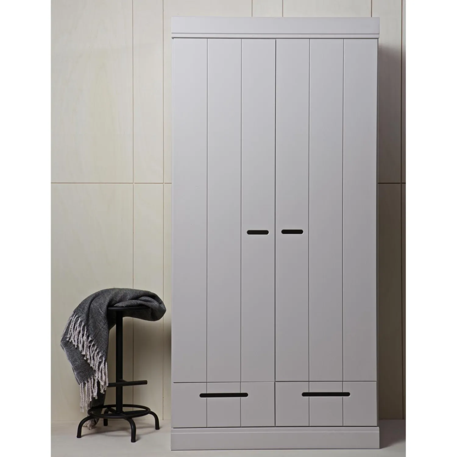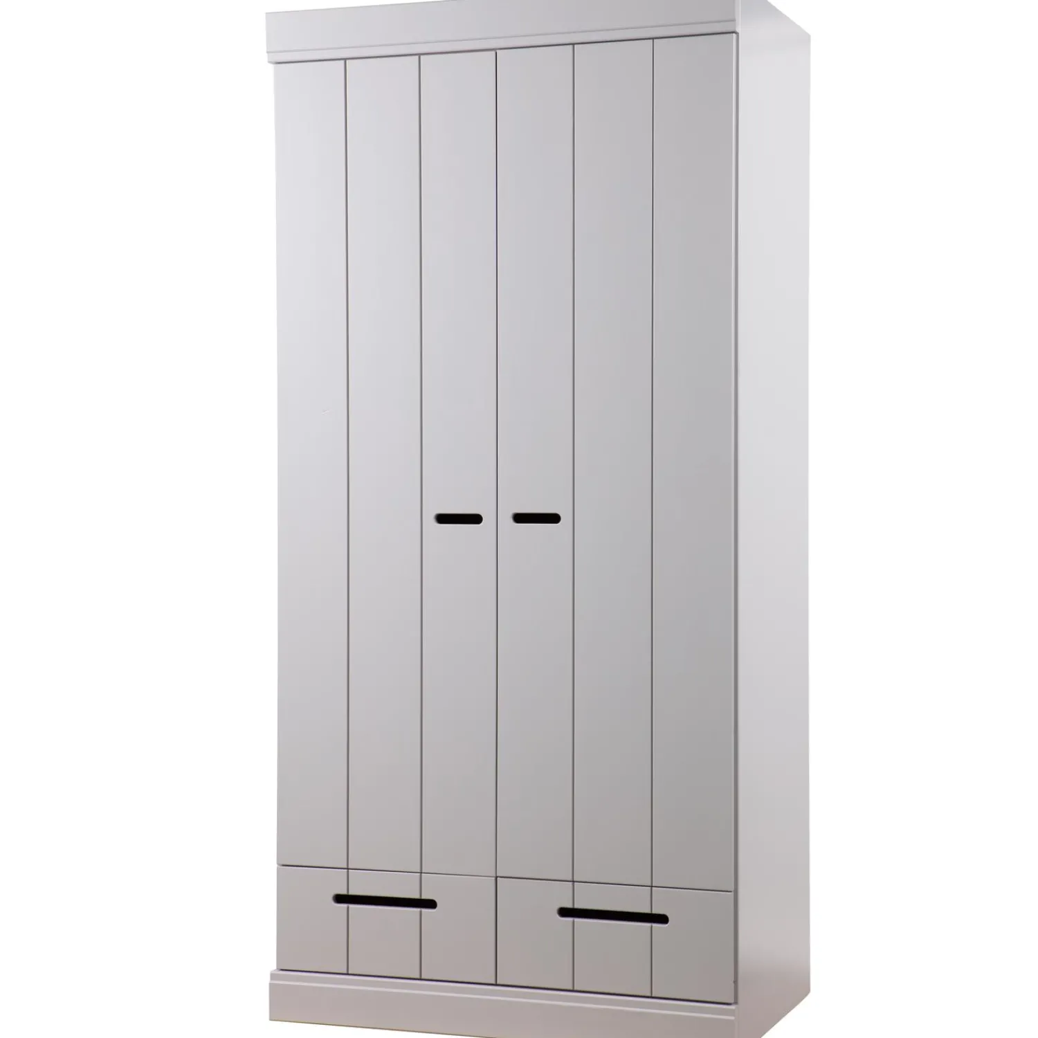 Nu ook in de kleur betongrijs. Uit de serie CONNECT; een stoere basic 2-deurs kledingkast met strakke sokkel en koof gecombineerd strokendeuren met sleufgrepen en 2 lades voorzien van solide metalen ladegeleiders. Met de CONNECT kasten kun je je eigen kastenwand bouwen! De romp van de CONNECT kledingkast is gemaakt van massief grenenhout dat afkomstig is van een FSC gecertificeerde leverancier. De binnenzijde is voorzien van gemêlamineerde legplanken, praktisch met schoonmaken! De kasten zijn in de kleur wit gespoten met een watergedragen lak).