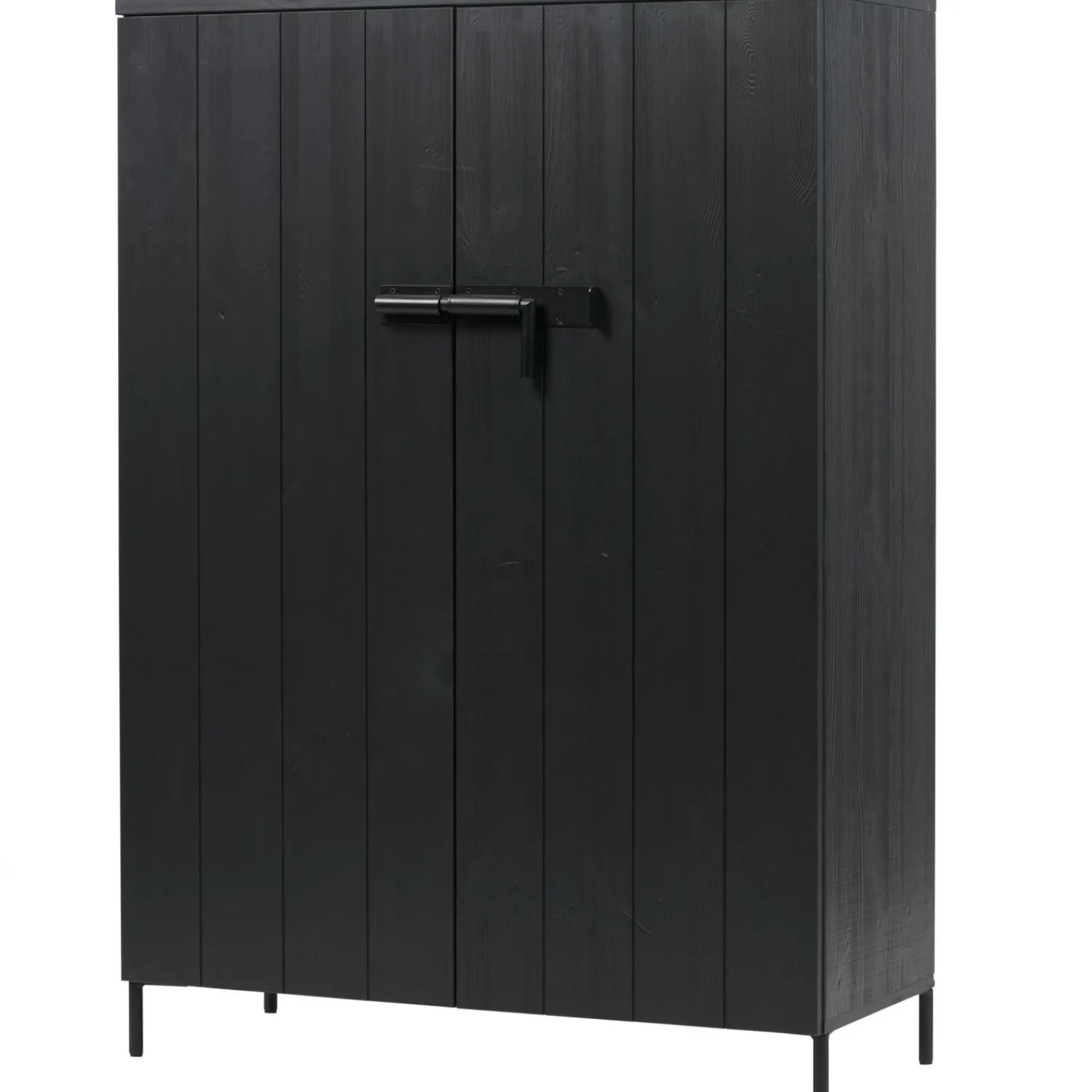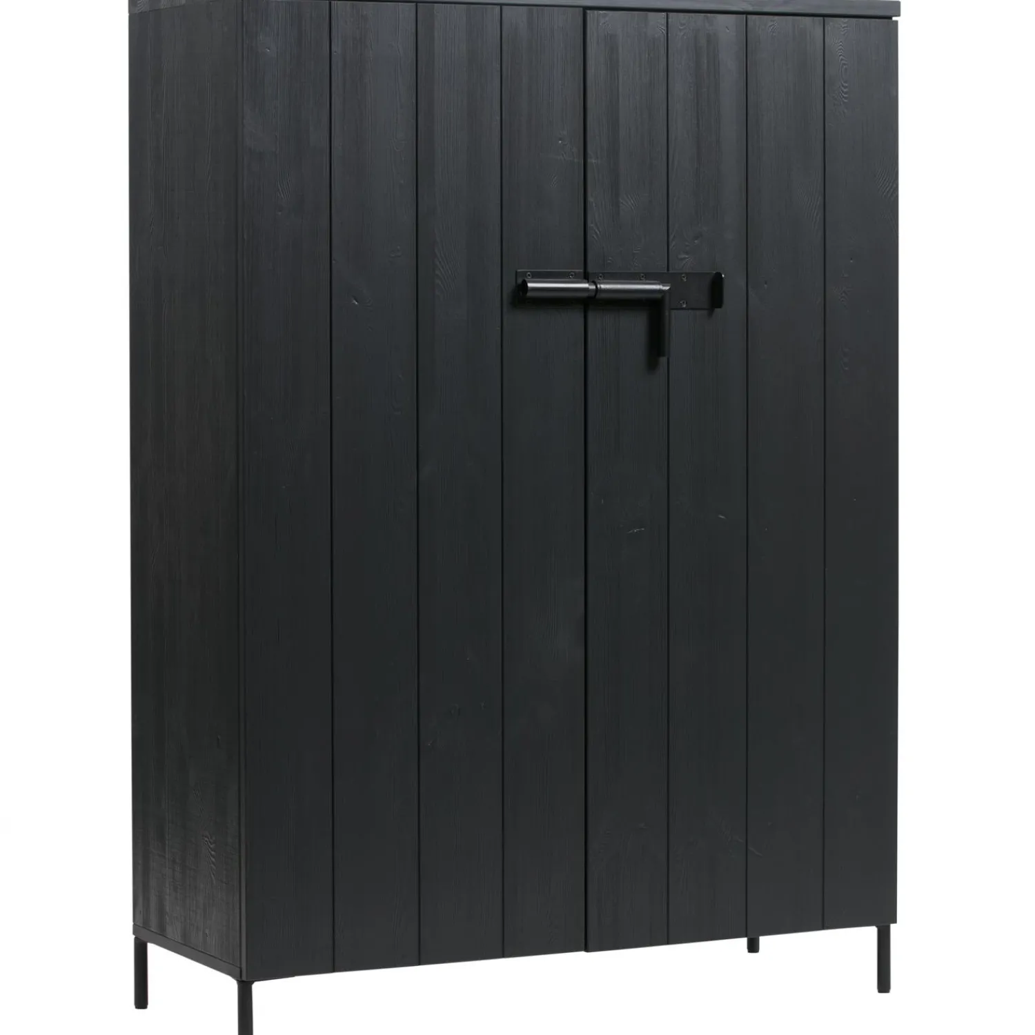 Deze massief, FSC gecertificeerd, grenenhouten legkast is gespoten in de kleur diep zwart en de deuren hebben een verticale V-groef belijning.