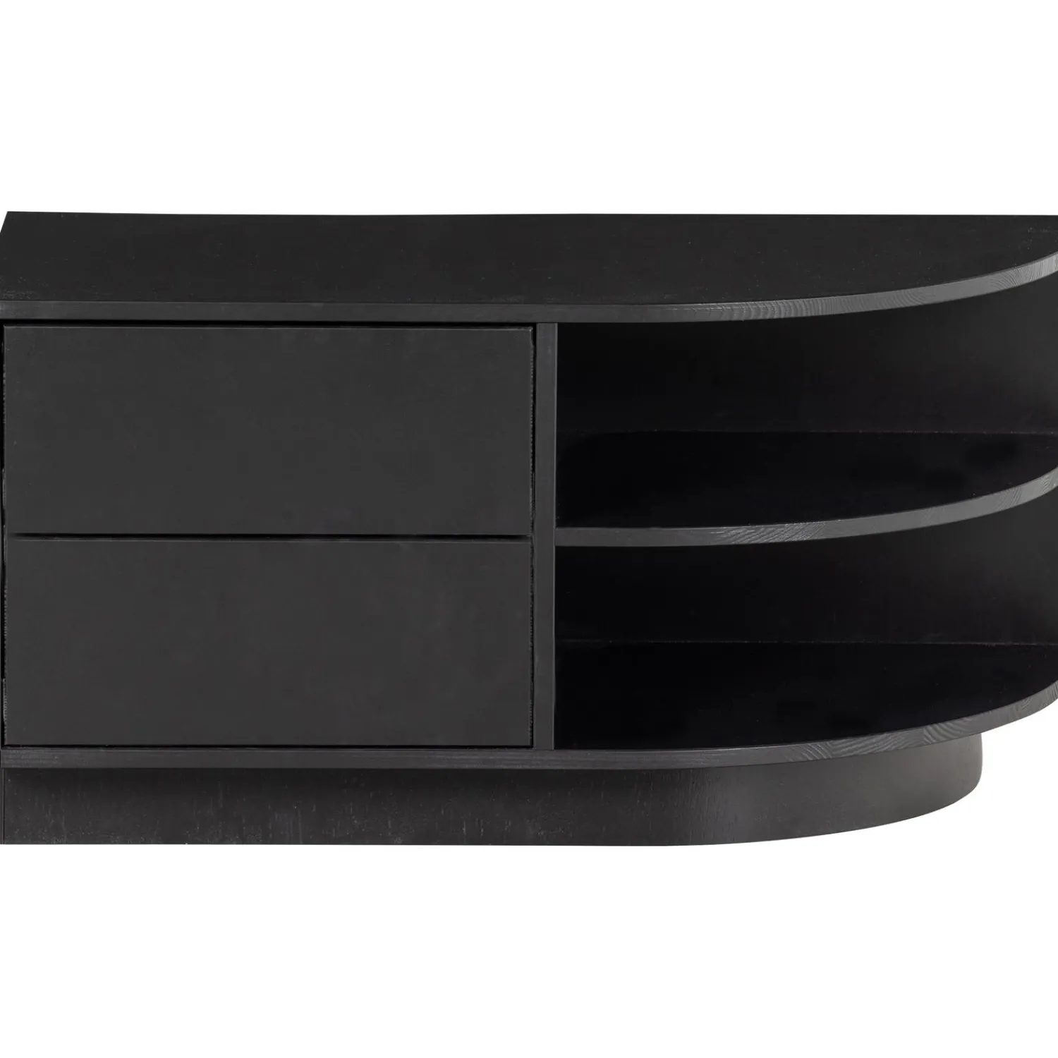 Het Finca tv meubel met rond element is een waar pronkstuk in de woonruimte. De open vakken bieden genoeg ruimte voor het presenteren van jouw mooiste woondecoratie. De twee laden houden nog eens een ruime opbergruimte uit het zicht. De onderrand van het tv meubel laat 7 cm ruimte over aan de voorzijde, hierdoor lijkt het meubel te zweven. Iedere plank heeft een draagkracht van maximaal 10 kg wanneer het gewicht gelijkwaardig verspreid is.
