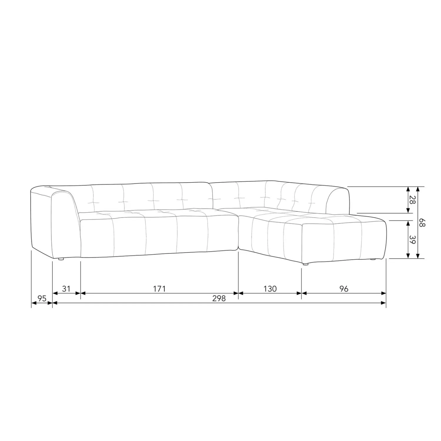 De Grid hoekbank heeft een hoogte van 68 cm, een breedte van 298 cm en is in totaal 98 cm diep. De zithoogte is 39 cm en de zitdiepte bedraagt 65 cm. De totale zitbreedte is 236 cm. De rugleuning is vanaf de zitting gemeten 28 cm hoog. De armleuning heeft een hoogte van 68cm met een breedte bovenaan van 21cm. De hoekbank is eenvoudig schoon te houden met een zachte meubelborstel. Plaats voor het beschermen van harde vloeren viltglijders aan de onderzijde van de vloerbeschermers.
