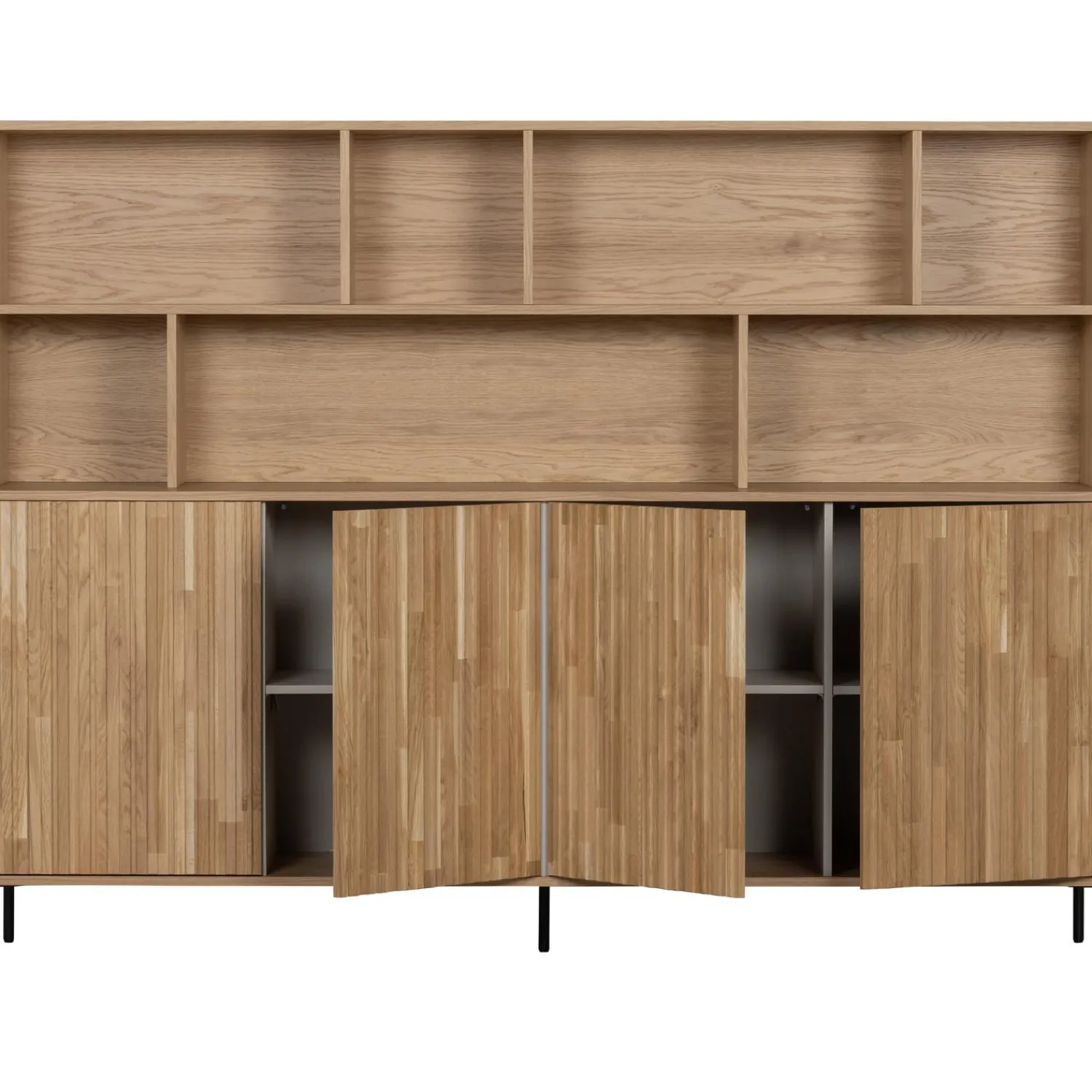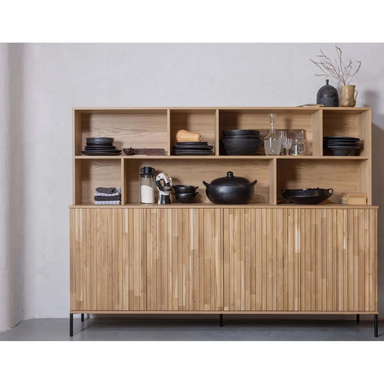 De New Gravure wandkast heeft een hoogte van 150 cm. De breedte is 200 cm en 44 cm diep. De opzetkast heeft een diepte van 30 cm. De bovenste vakkenrij heeft een hoogte van 31 cm en verschillende breedtes van +/- 60 cm en +/- 31 cm. De onderste vakkenrij heeft drie vakken met een hoogte van eveneens 31 cm en breedtes van 31/100/62 cm. De diepte van de vakken is 28 cm, de tussenpanelen zijn 2,5 cm dik. De vier deuren zijn elk 66 cm hoog, 50 cm breed en 2 cm dik. De dichte kast beschikt over vier uitneembare legplanken die tevens in hoogte verstelbaar zijn. Door de legplanken worden er acht vakken van 32,5×47,5×41 cm (hoogte x breedte x diepte) gecreëerd, genoeg opbergmogelijkheden dus. De metalen poten zijn 15 cm hoog en hebben een diameter(ø) van 2cm.