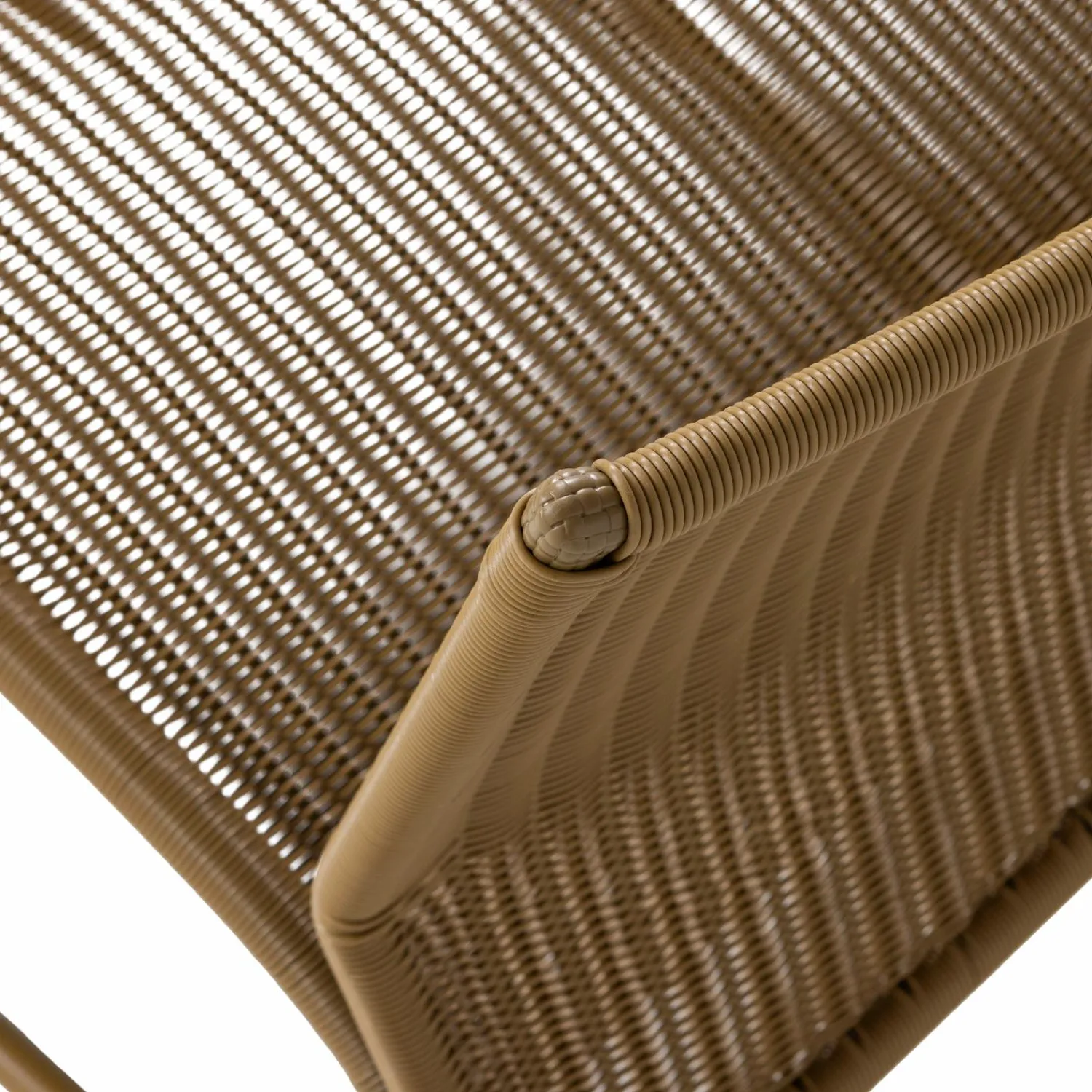 De stoel is gemaakt van kunststof met een gevlochten structuur die zorgt voor een natuurlijke uitstraling. Het weerbestendige materiaal is speciaal ontwikkeld voor buitengebruik en houdt goed stand tegen verschillende weersomstandigheden. Het gevlochten patroon is niet alleen mooi om te zien, maar ook functioneel en stevig.